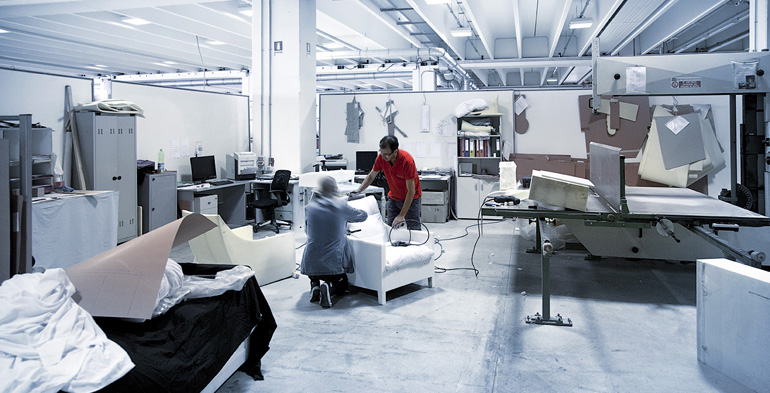 The creative project work of Designers, Architects and Clients is transformed into reality through the activities of development and realisation of the prototypes. Furia Cuscini’s technical office is arranged in Project Teams, made up of a Technical-Commercial Director and prototype creators who carry out the realisation of the components (structures, upholstery and coverings) of the model and its variants. This technical know-how, placed at the service of the clients, is further enhanced by suggestions concerning materials and technical or production solutions drawn from the company’s know-how and experience. The development process, which includes meetings with the Client and their designers, involves evaluation of prototypes, realisation of modifications and final approval. The technical office completes its activities with the industrialisation of the product by preparing production and checking modules for all departments involved. This ability to work hand-in-hand with Clients in “co-design” is recognised as an aspect of excellence of Furia Cuscini, and has contributed to its growth among Clients both within and beyond the European Union.