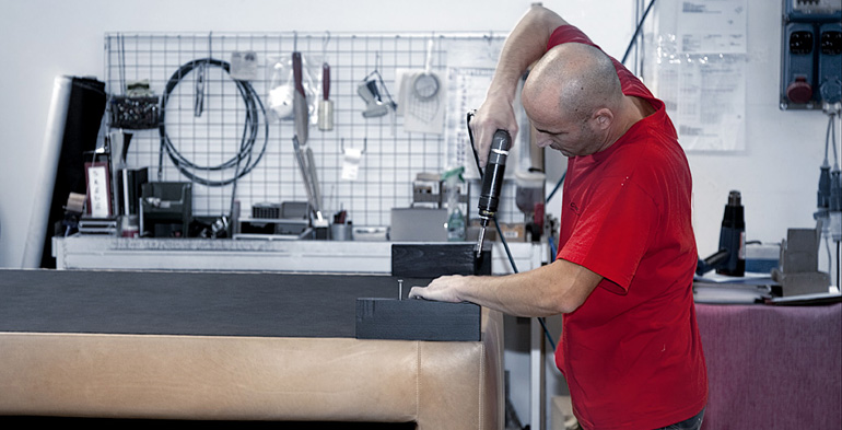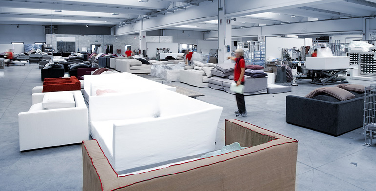 The process of manufacturing finished goods: is efficiently organised in departments: structures, upholstery, assembly, filling with down/feather, cutting of hides and textiles, packaging and covering. Each phase involves dimension and visual checks which conclude in the final phase of assembly and application of coverings. No less important is the application of labels, product and accessory specification cards, as requested by the Client in terms of product and packaging specifications. The recent installation of a line for the creation of boxes and following packaging has indeed led to the industrialization of this phase too, reducing human errors and waste. The transfer of the finished product to the Client’s premises is supported by a logistics procedure in various stages depending on the client’s requests. Goods can be delivered directly from Furia Cuscini to the Client’s storeroom or platform or again to the premises of various addressees indicated in the shipping document. Given that conformity of the product with the Client’s specifications is a “pre-requisite”, what distinguishes Furia Cuscini is its desire to offer its Clients a service that goes from the first contact for the development of prototypes and runs on through all the phases of production, delivery and after-sales service. The company is trained and equipped to serve the most demanding, innovative Clients operating in advanced markets and focusing on Quality, Safety and Environmental concerns.