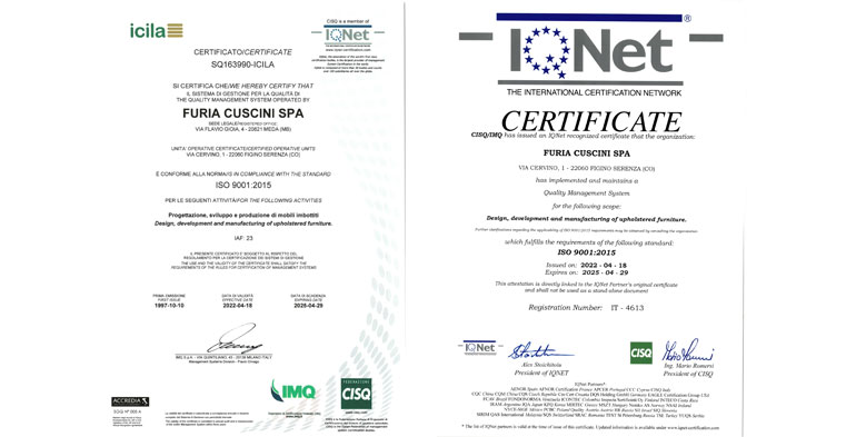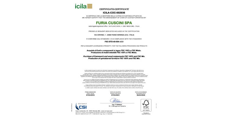 Furia Cuscini SPA ha implementato sin dal 1997 un Sistema di Gestione per la Qualità certificato in conformità alla norma UNI EN ISO 9001. Tutti i processi sono “regolati” da procedure e istruzioni operative, costantemente aggiornate rispetto alla evoluzione tecnica, normativa e legislativa. Il Sistema Qualità è integrato alla gestione della Sicurezza (D.Lvo 81/08 e s.m.i.), creando così i presupposti fondanti il “Modello Organizzativo” attuato in azienda secondo il Decreto Legislativo n. 231:2001. A compendio della certificazione aziendale, Furia Cuscini SPA attua una gestione controllata dei certificati di omologazione dei materiali di imbottitura ignifughi, come richiesto dai Clienti e a fronte delle normative vigenti in Italia e nei Paesi CEE ed extra CEE. per la tracciabilità del legno, proveniente da foreste certificate, costituisce uno degli aspetti chiave della sostenibilità del suo business che, integrato alle politiche aziendali riguardanti Qualità, Ambiente, Sicurezza e Responsabilità Sociale, ne caratterizzano la missione.La certificazione FSC® per la catena di Custodia del legno (COC), conseguita nel marzo 2016 e confermata fino ad oggi, attesta l’impegno della Società nell’approvvigionamento di legno “legale” e tracciabile lungo la filiera di trasformazione e produzione di mobili imbottiti fino al consumatore finale.